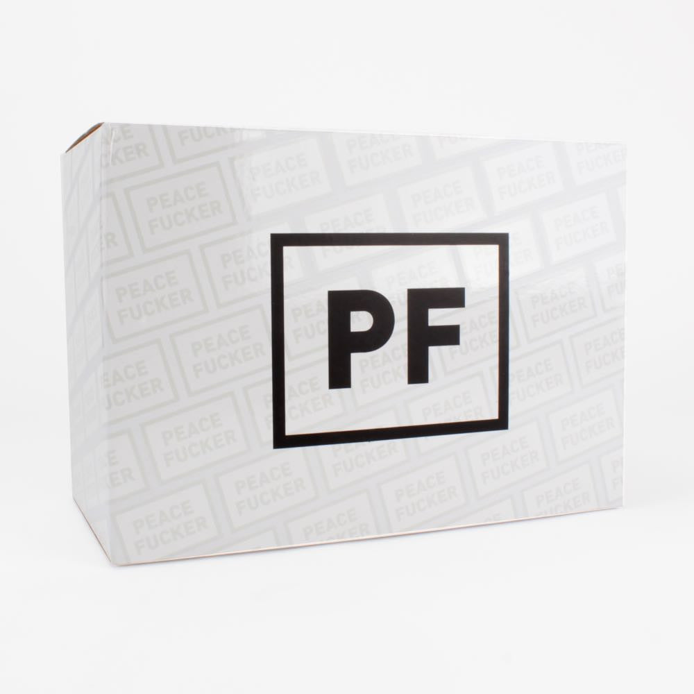 NOZZEL s005 [PEACE FUCKER] includes: 6” Squadt vinyl figure, removable Nozzel helmet, Peace Fucker shirt, tactical vest w/ removable pouches, SM4 with suppressor, sMAC10 , PF patches, Peace Fucker human size patch and 2 sets of lenses plus classic and 2.0 arms.