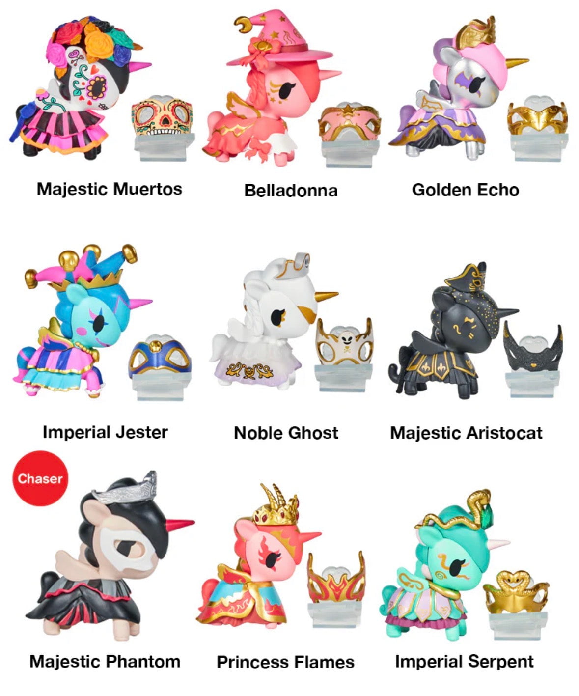 • The Tokidoki Unicorno After Dark Masquerade Blind Box features 9 unique collectible figurines, each with distinct costumes and fun accessories like Majestic Muertos, Belladonna, and Imperial Serpent. Surprise inside every box!.