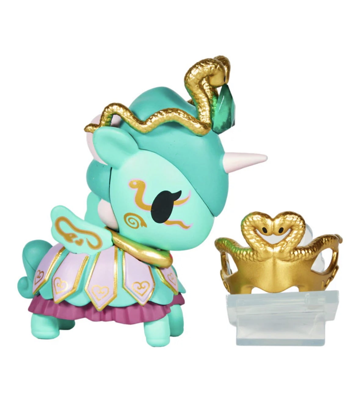 • The Tokidoki Unicorno After Dark Masquerade Blind Box features a turquoise collectible figurine with gold accents, a snake-inspired headdress and crown, and comes on a clear stand—ideal for any Blind Box collection.